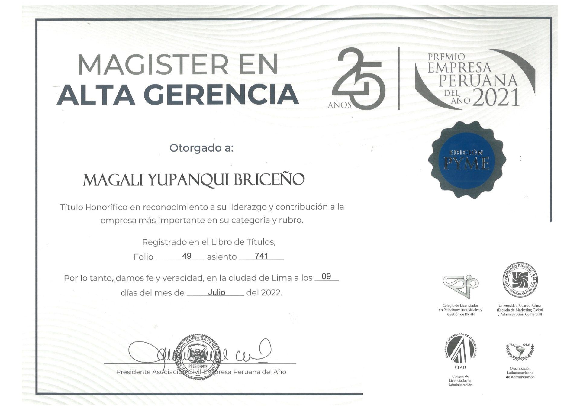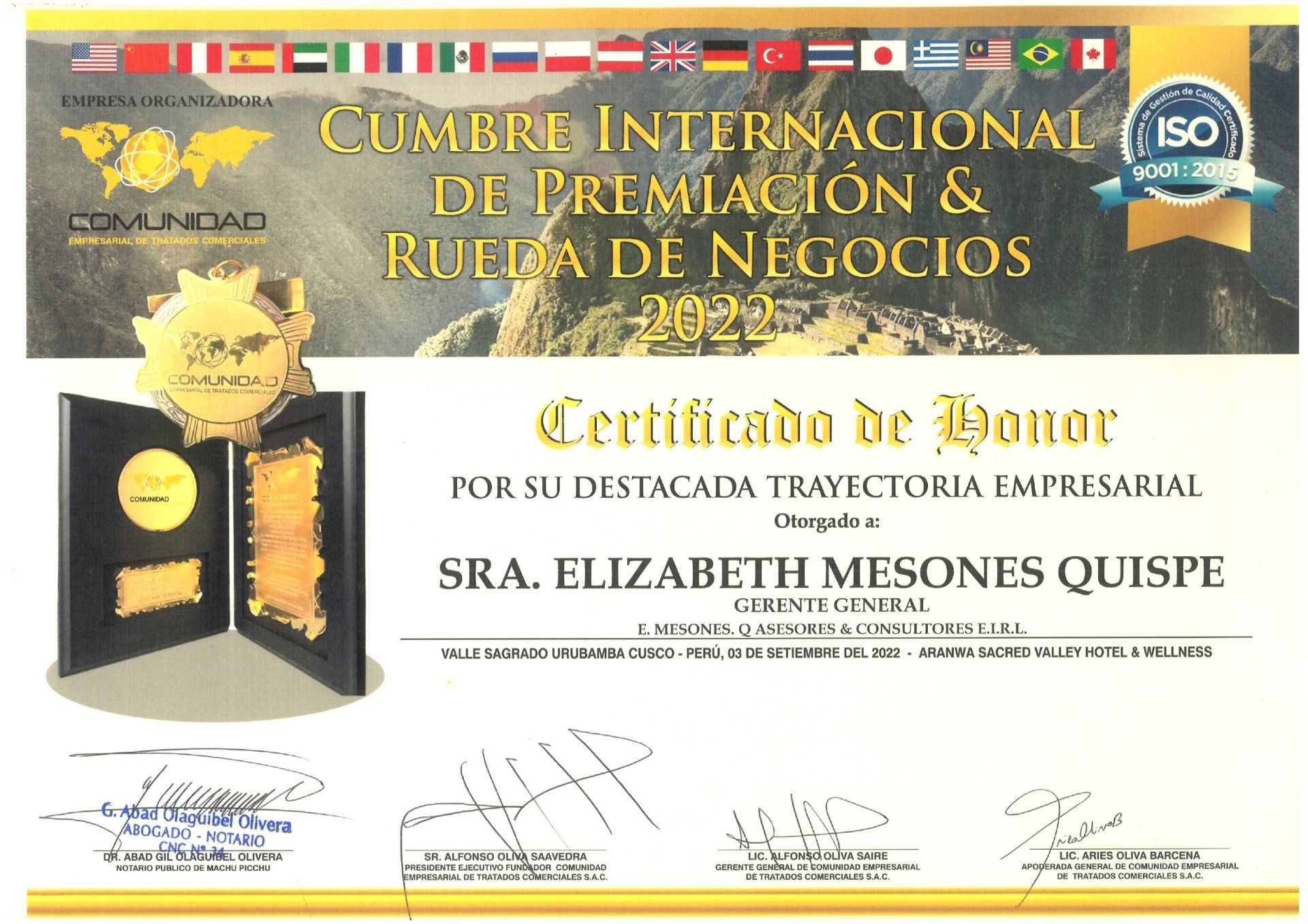 CERTIFICADO DE HONOR POR SU DESTACADA TRAYECTORIA EMPRESARIAL