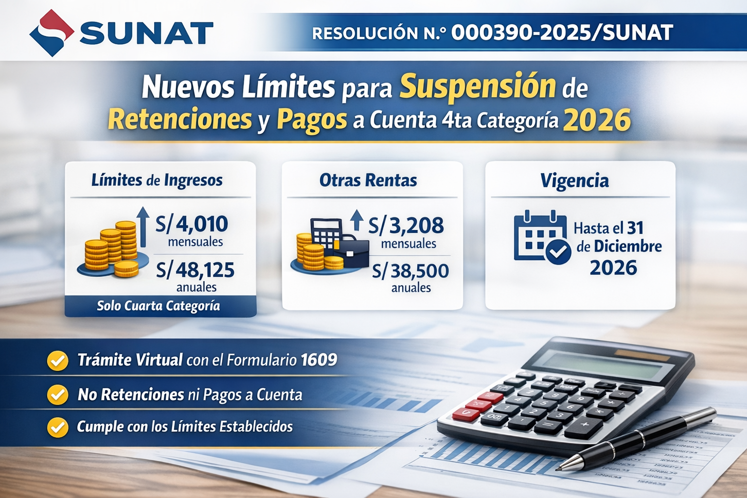 Conoce los nuevos montos para la suspensión de retenciones y pagos a cuenta de cuarta categoría en 2026 según la Resolución SUNAT N.º 000390-2025. Guía práctica para independientes.